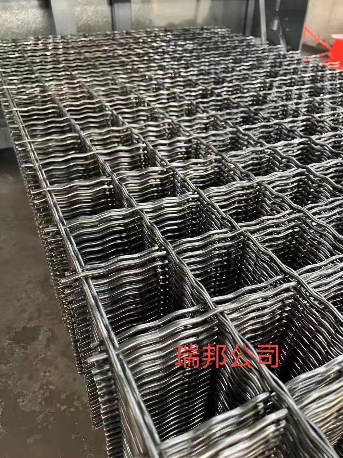 安平县瑞邦公司专业生产矿用新型轧花编织网,轧花编织网是经过拔丝然后去绞丝机去压成波浪形的根丝,在人工编织最后焊接,焊接分为机器热融焊接和人工二保点焊。